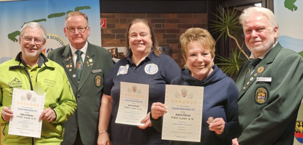 Präsident Detlef Temmen und Vizepräsident Gerold Heinze vom Ostfriesischen Schützenbundhaben am 6. Februar zu einer Feierstunde im Schützenhaus des Auricher Schützenverein geladen, um die Teilnehmer an den Deutschen Meisterschaften 2025 gebührend zu ehren. Auch unsere Schützen Astrid Dönch (10m Luftpistole Auflage / Hannover), Ewald van Rüschen (Perkussionsrevolver und Perkussionsgewehr / Hannover) und Gretchen EwenSchöberl (25m Pistole / München; Sportpistole Auflage / Hannover) konnten eineErinnerungsnadel und eine Urkunde in Empfang nehmen. Man sieht ihnen die Freude über diese Ehrung sichtlich an.